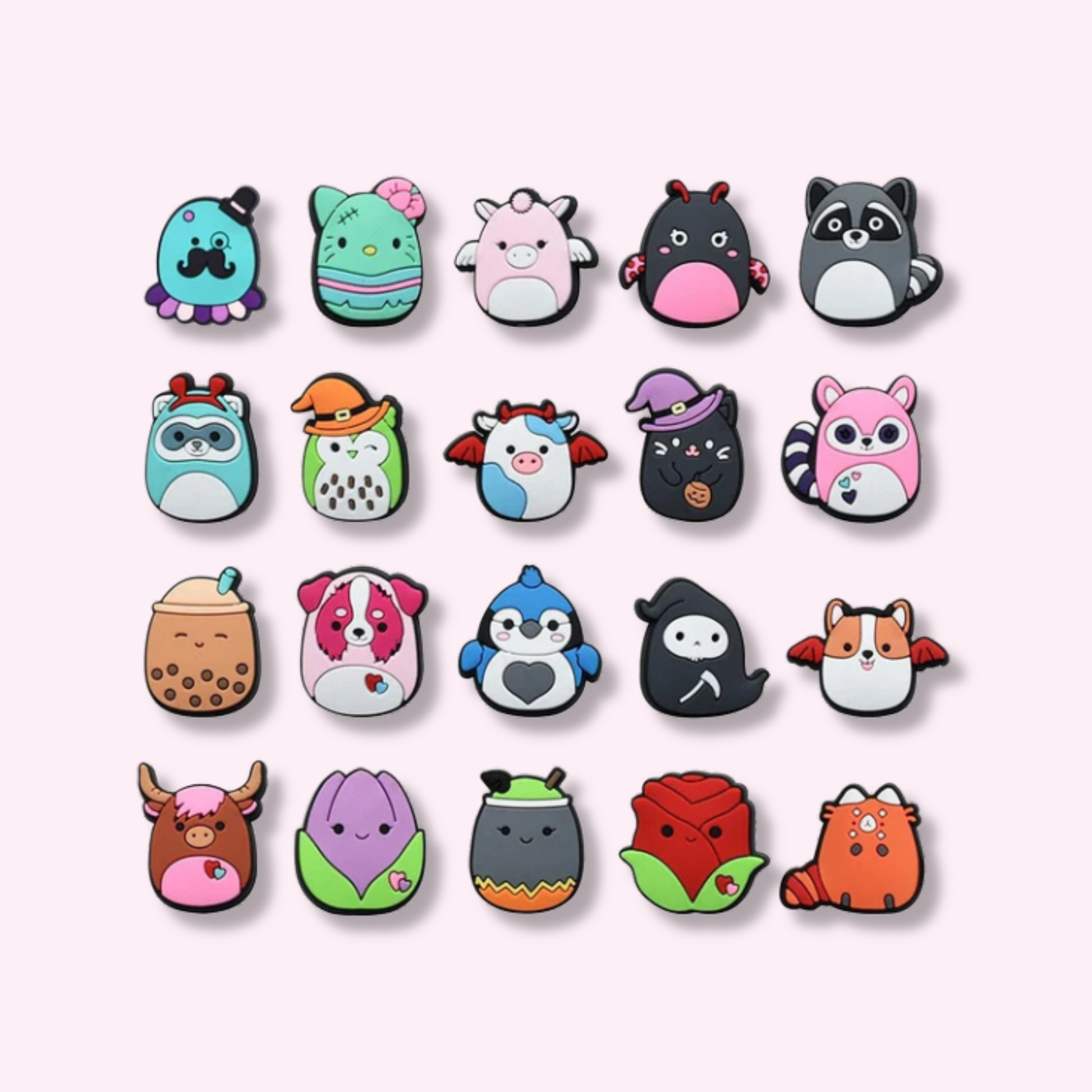 Beautiful set of 20pcs colorful and unique kawaii PVC shoe charms to add vibrant colors and personality to your sandals. Fun to mix and to collect! You will get animals, flowers and a cute boba tea drink charm.