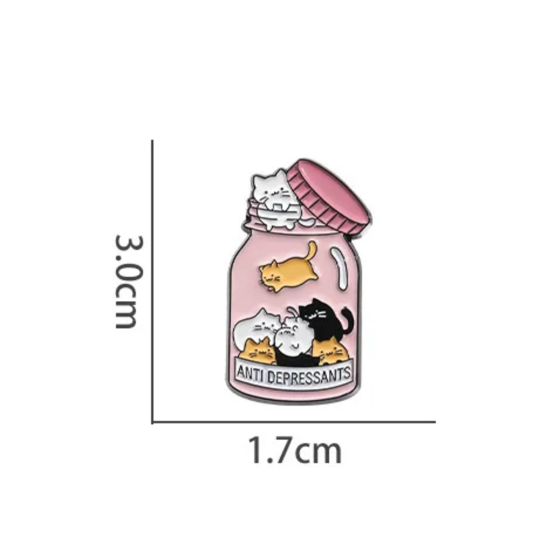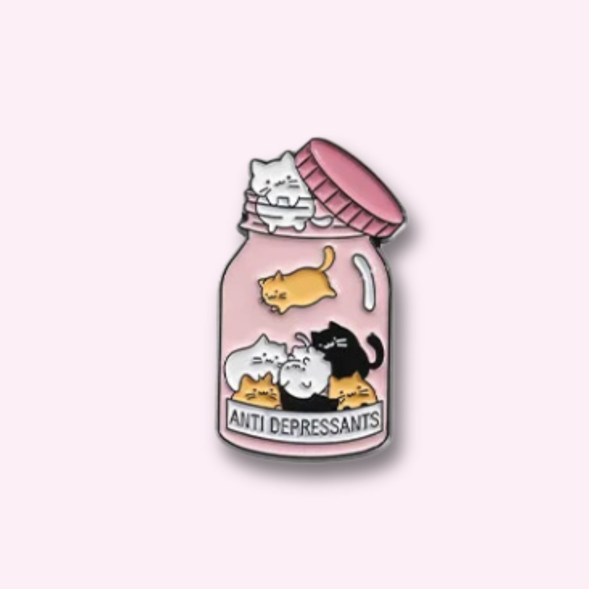 Cute and funny enamel pin designed as anti depressants medicine jar filled with cats. The perfect gift for cat lovers. A funny pin/brooch that you can wear in your clothes, hat or pin it in your backpack or bag.