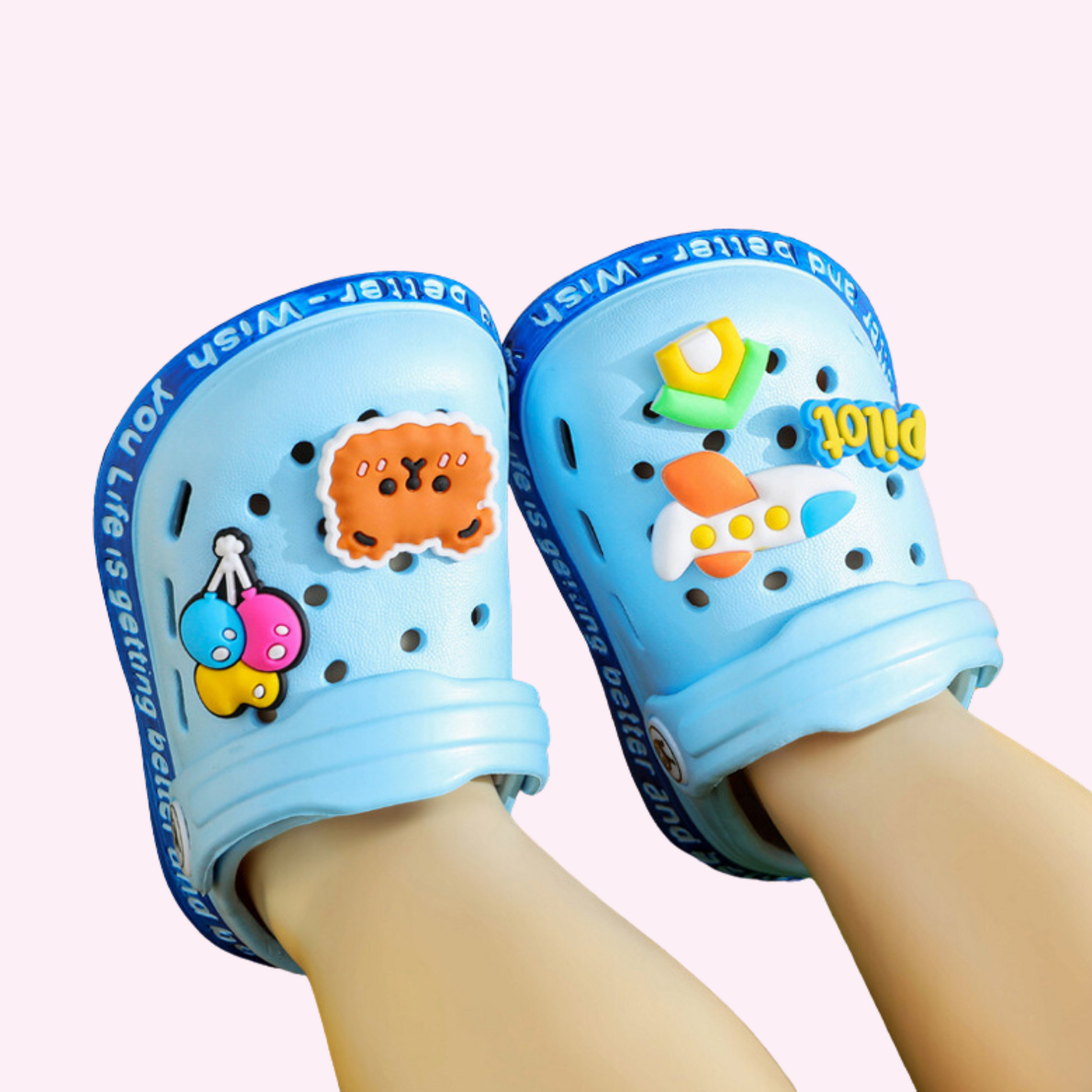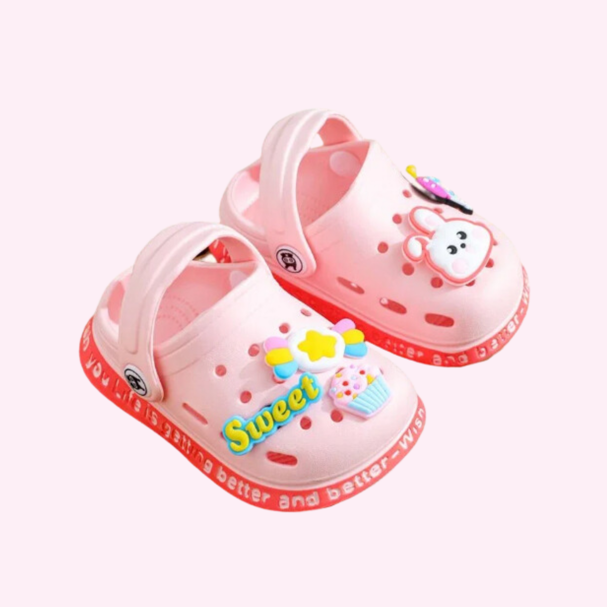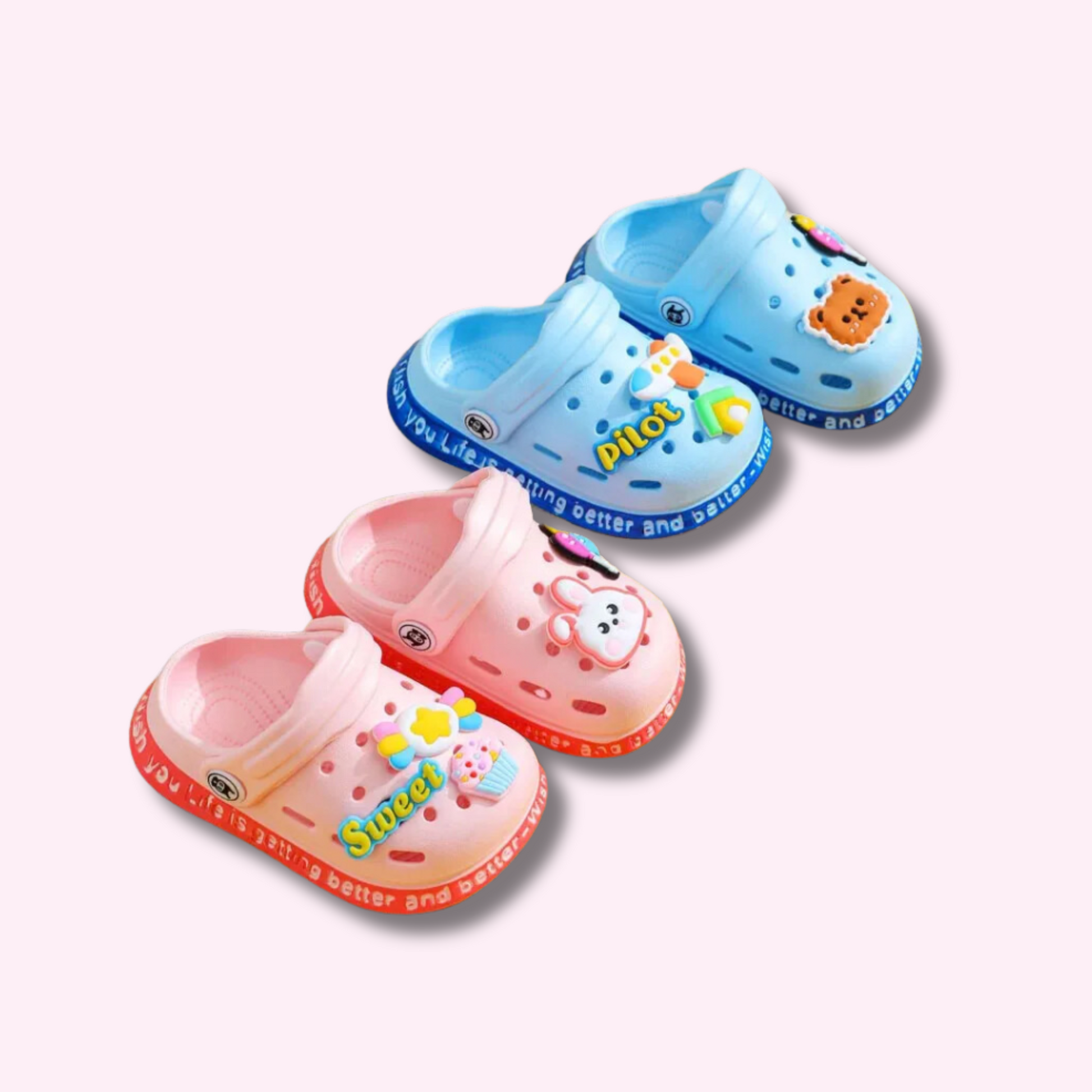 Cute and happy sandals for kids. Available in blue and pink including beautiful and colorful charms for children to create a unique and vibrant style.