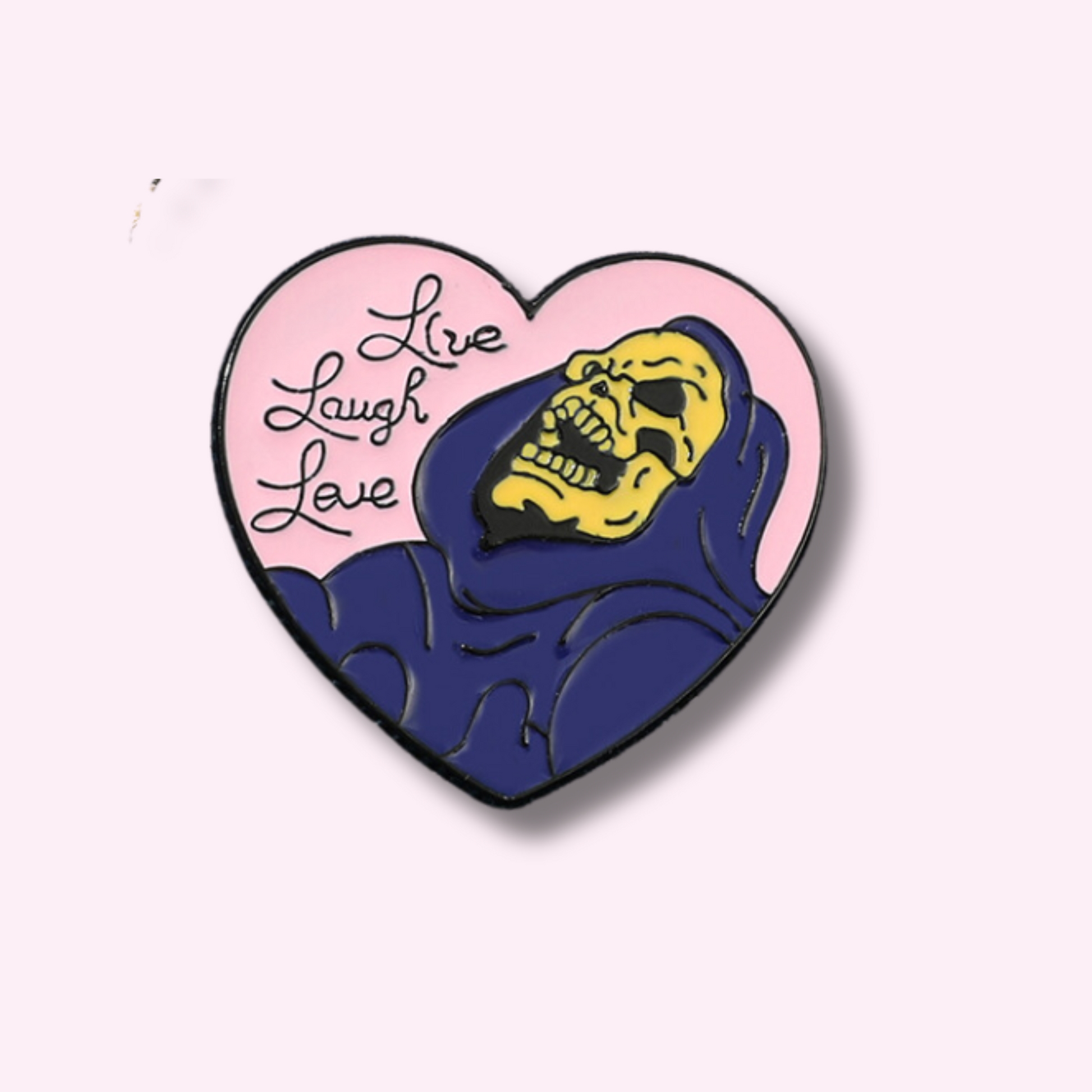 Funny "Live Laugh Love" Skeletor enamel pin. Activate the 80s nostalgia with this heart shaped pin which is a great accessory for anyone with good sense of humor and love for old cartoons/anime. You can wear in your clothes, hats or pin it in your backpack or bags in any season for a cool retro style.