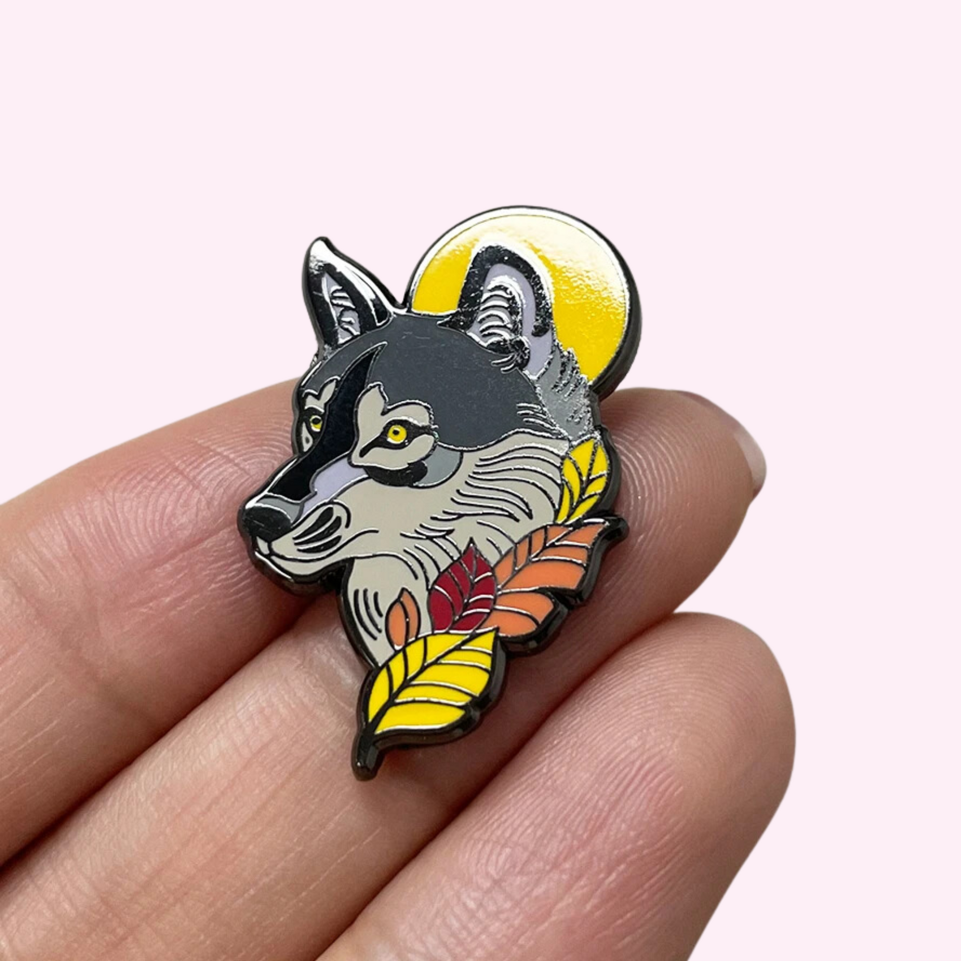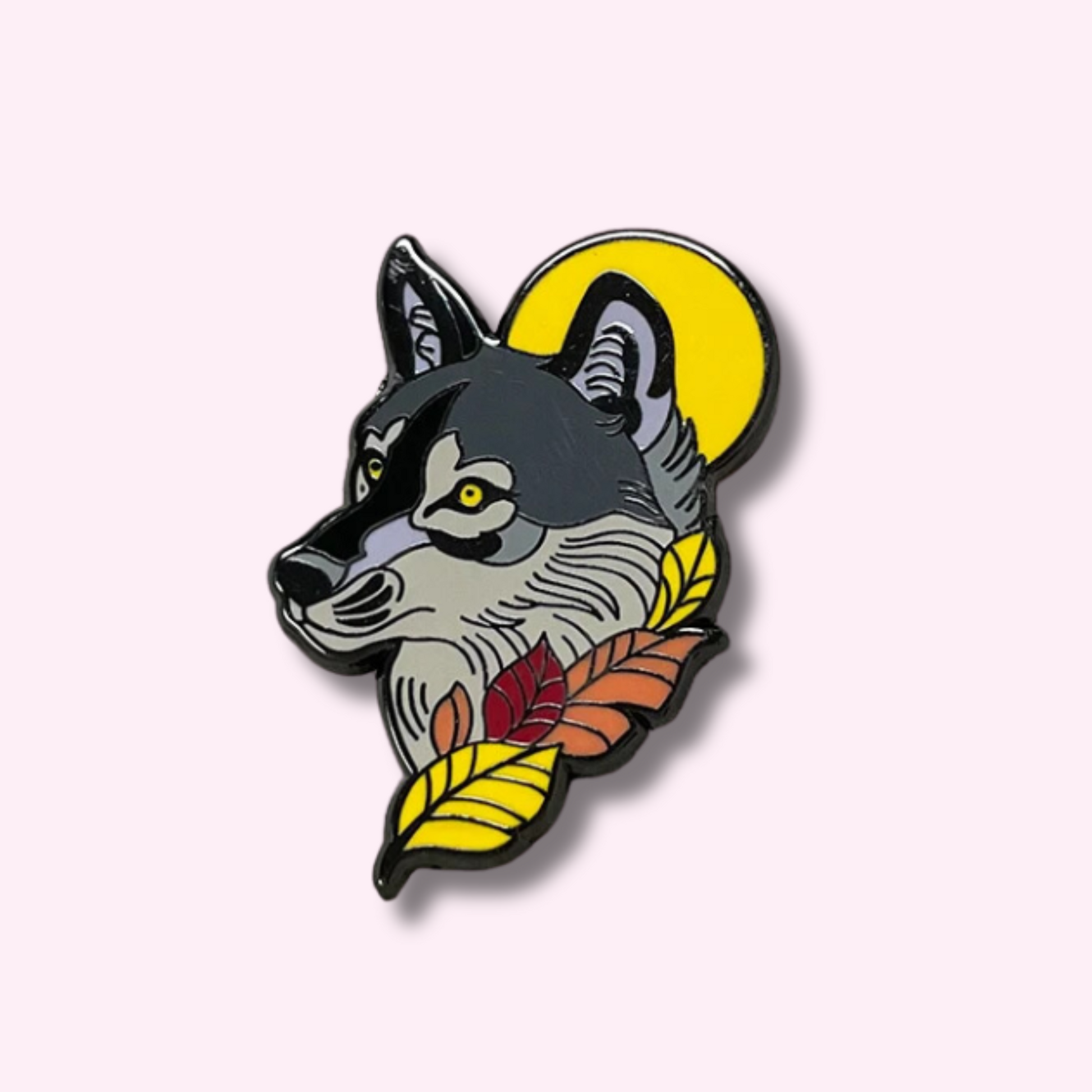 Beautiful wolf enamel pin, with autumn/fall leaves. You can wear in your clothes, hats or pin it in your backpack or bags for decoration. Also a great gift for anyone that loves collecting pins.